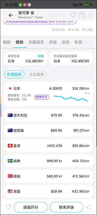 5、点击某款游戏,可以看到相关的所有商品,所有地区价格和支持的语言,以及评论资讯等等