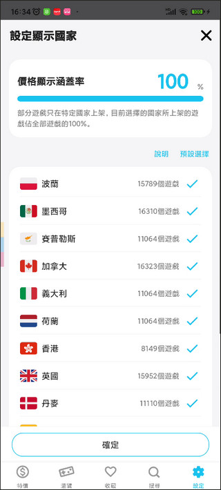 9、如果有不想看到的地区国家信息,或者只想现实特定国家的折扣价格,可以在设置里进行选择显示