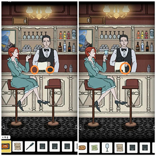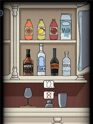 7、把鹅肝给服务生会给你一把钥匙A,用钥匙A打开锁上的酒柜,把空酒杯放在酒柜的下面,按照笔记残页配出爱尔兰马天尼(分别放入每份1次2次不同的比例,点击调酒杯出现的一个图标是开始摇,下面的是倒掉,如果配的酒不对或者之后还要酒,可以接着从柜子上拿空酒杯)