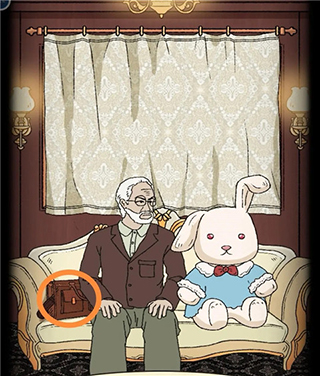 10、重新回到老先生这里,发现他会让你找兔子的眼睛,用木棒够沙发右侧地毯上的玩偶眼睛,交给老先生,把追踪器放在老先生身后的包里,并从他的手里得到营养剂给胖男人
