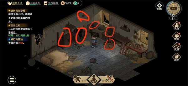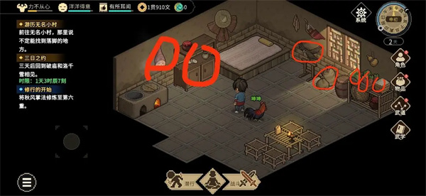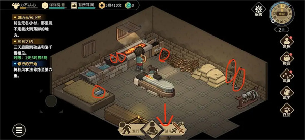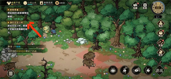 上完香点开角色面板就能看到状态,之后去迷踪林,把鱼吃了回点体力,来到之前开完箱子不让你们往右走的地方,往右走有一堆野猪,战斗结束把灵芝捡走,之后往左下方走,遇到山贼求救,我们选择帮他,战斗结束后刚好十级,师傅会来传授功法,别忘了学习一下,十级获得的资质点我加给臂力了,继续往里面走,路边有个箱子别忘了开,走到最里面触发挖宝藏,然后往回走,继续深入地图,路边的浆果都捡一捡,如果之前给洛千雪吃的野猪肉,最好在这刷四个野猪肉出来,往下走有个烂木头,把上面的灵芝捡了,之后往上走进入悟道之地,如果有十个浆果直接给猪猪就行,没有可以跟他战斗或者潜行绕过去都可以,点击石碑,悟性一习得绝招石破天惊,石碑后面有个装备可以捡,现在回到破庙和洛千雪切磋三次,修罗模式注意存档,第三次切磋卡血量让老头出来打,得到剑穗后离开破庙前往无名村。