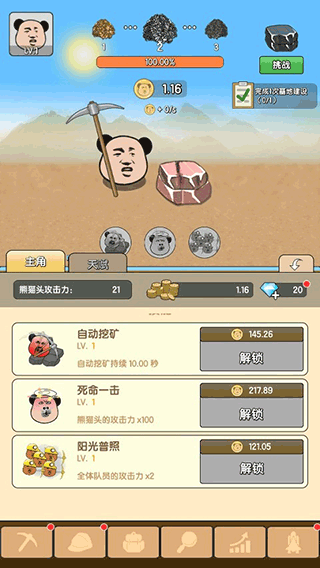 3、在底部的导航栏中,不同图标代表着不同的玩法与功能,如点击镐头可以升级熊猫头的攻击力,提高挖矿效率,若手动点击太累则可以解锁自动挖矿等强力“技能”。