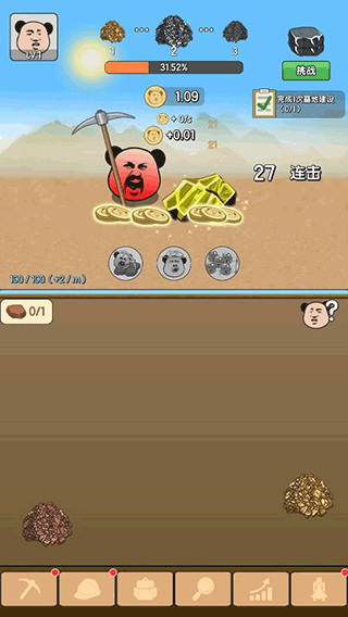 熊猫矿工是一款沙雕小游戏,游戏中的大部分人物都是网上比较火的熊猫头表情包,玩法也比较简单,主要还是放置挂机的玩法,玩家点击屏幕能够操控熊猫头挖矿,点击的速度越快,挖矿的速度就越快!而在升级熊猫头属性的时候,那上面显示的都是攻击力,玩家点击了一定次数,把矿打死之后就可以掉落矿石,同时稳定掉落一块钱,花了一定数量的矿物之后,还会进入一个挑战关,在有限的时间内干掉一个血比较厚的矿物!这个挑战很简单,玩家基本上几秒就能点完,而关卡给了十几秒的时间,很宽裕,不过如果实在是想做一个平静的矿工,不想搞这些大钱的话,也可以点击左边的按钮放弃。怎么样是不是操作非常简单,感兴趣的朋友快来下载吧!