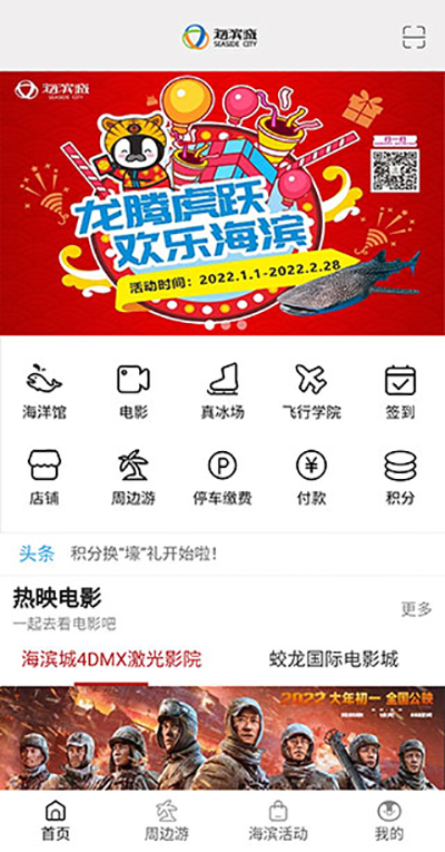 1、首页:进入海滨城app首页,我们可以看到一些常用的功能,如海洋馆、电影、签到、付款和积分等;