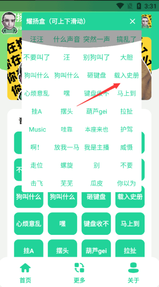 耀扬盒是最近火爆的一款语音恶搞软件,与鸡乐盒出自同一个工作室之手。软件的界面非常的精美,各种内容非常的全面,汇聚线上各种热门网络资源,你们可以按照自己的喜好来选择一个你们自己喜欢语音,然后你们可以使用语音做各种有趣的事情,例如:在和朋友开黑的时候,时不时的来一句梗,让游戏的氛围变的愉快起来,逗得大家哄堂大笑!并且软件使用也是非常的简单,只需要点击对应的字点一下就可以让耀扬发出对应的声音。因为软件刚刚推出没有多久,内容情况不是特别多,所以如果你有什么好素材的话也能向工作室提出建议,这样的话大家都能使用到更好好玩搞笑的语言包啦!