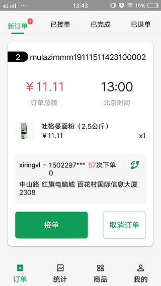 4、有了新的订单可以选择接单或是取消订单,商家可以体验选择性的接单方式;