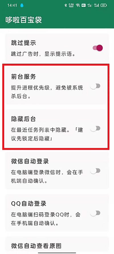 3、将【前台服务】、【隐藏后台】等权限开启,即可避免被后台误杀;