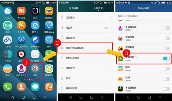 步骤一:检查手机设置中的“受保护应用”列表,查看客户端是否开启保护(查看方法:设置->全部设置->受保护的后台应用->开启“天翼校园”保护状态),若未开启,开启保护后重试;