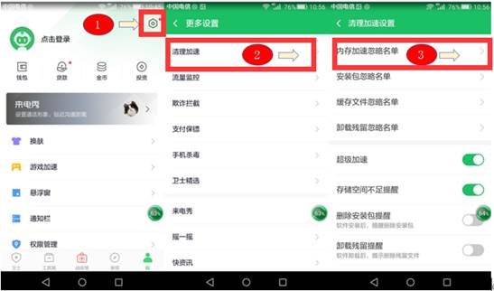 步骤二:检查手机中是否安装有第三方手机防护软件(如360卫士、腾讯管家、LBE安全大师等),如果安装了此类软件,检查客户端是否已添加到了手机防护软件中的加速清理白名单中,若未添加,请添加后重新连接。