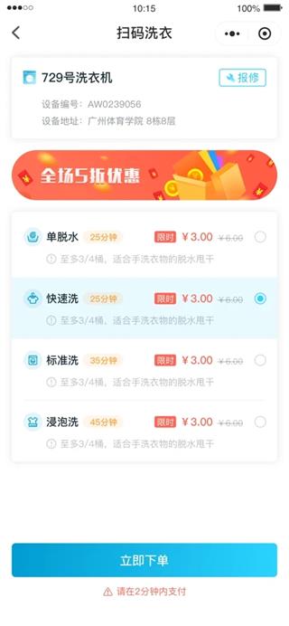 这款App的操作也很简单。扫个码选程序,付钱支持支付宝、微信这些常用的支付方式,还能实时追踪洗衣进度,洗完还会提醒你取衣服。最新版本还增加了报修功能,客服联系方式直接在手机上就能找到。
