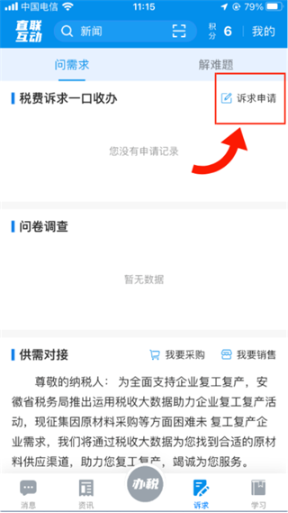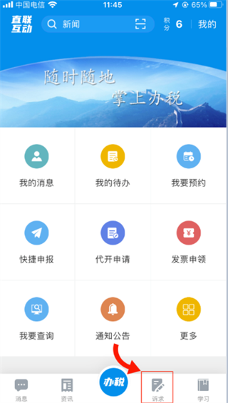 1、用户首先在应用登录页面中完成自然人办税注册、实名认证操作,然后进入应用界面后点击底部导航栏中的【诉求】