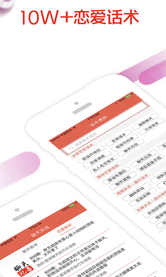 恋爱话术App是盐城和派商务信息咨询有限公司开发的一款恋爱话术应用助手。谈恋爱最重要的是谈,可是谈的时候我们会遇到各种各样的问题:和女生聊天没有话题?不知道怎么逗乐女生?女生生气了不会哄?不知道怎么让女生愿意跟你聊下去?不知道女生对你有没有意思?恋爱话术App可以帮你解决以上烦恼的,4W+话术库,遇到不知道怎么回复女生时,来这里搜一下,N+精彩回复供您选择,让您和女生聊天不再烦恼。聊天恋爱全掌握,不会聊,只需搜一搜,就能用它跟妹子聊嗨!恋爱话术,聊天话术最靠谱的撩妹神器,土味情话发源地,几乎所有的人在恋爱中都在努力变的最好,要想改变这些,必须下载恋爱话术APP,手把手教掌握恋爱聊天技巧。