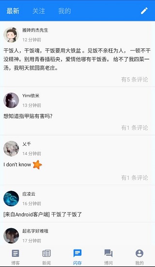 动态(闪存):查看最新动态、新回应、我的关注的人的动态、我的动态、删除评论动态、发布动态,如果需要发博客,就在动态里面开始写博客。