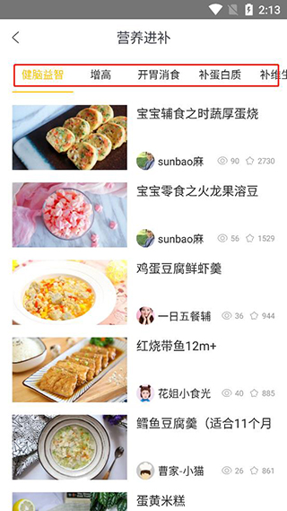1、下载宝宝辅食大全app后在首页上可以看到有月龄、营养进补、健康食疗;