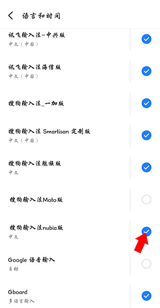 2、进入输入法相关选项后,勾选搜狗输入法努比亚版(nubia版)