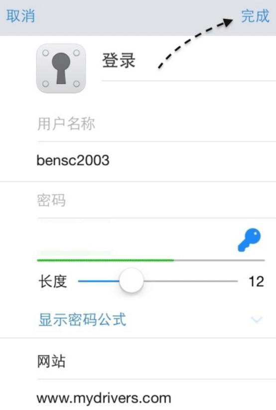 8、正确填写登录的用户名、密码、网站信息,再点击“完成”按钮,将密码信息保存起来。