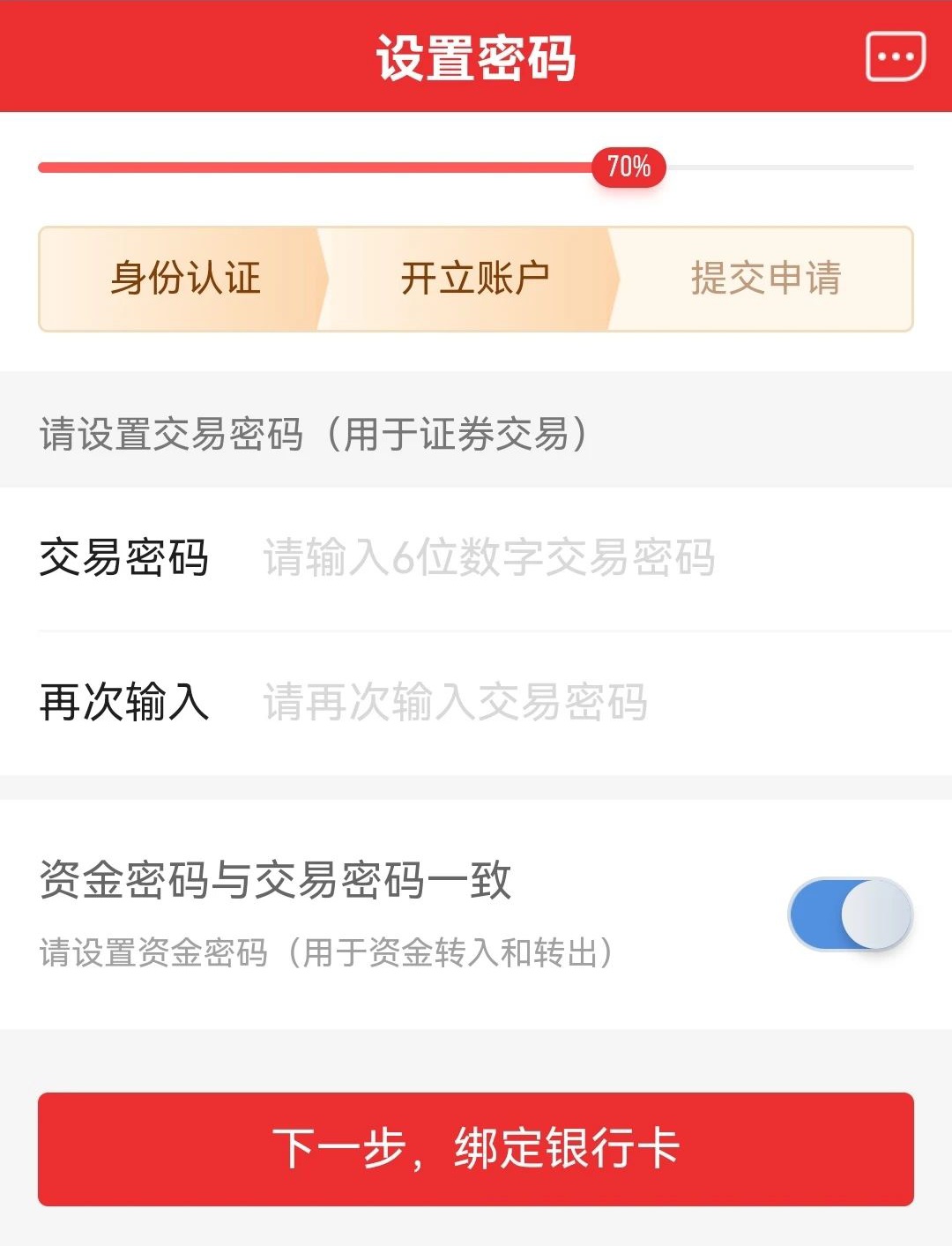 8.设置密码,六位数字,交易密码是登录APP时使用的,资金密码是钱从银行和证券账户转进转出时候用的。忘记密码或者修改密码都能在app完成