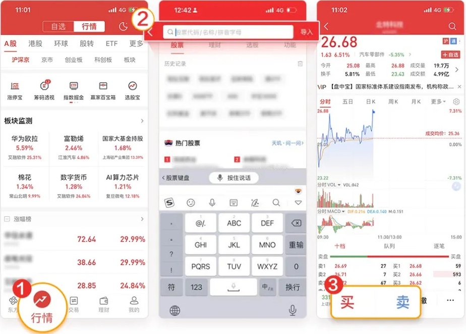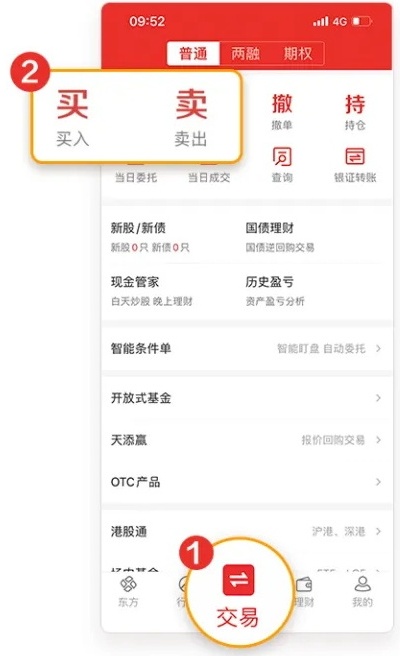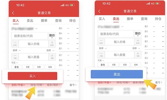 前往【行情】频道,搜素查看个股,在【个股行情】页面点击【买】/【卖】按钮,即可进行委托。