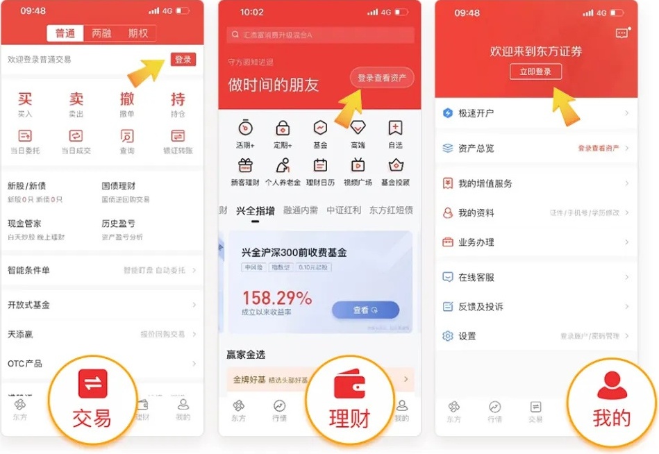 ●前往【交易】、【理财】、【我的】频道- 点击【登录 】