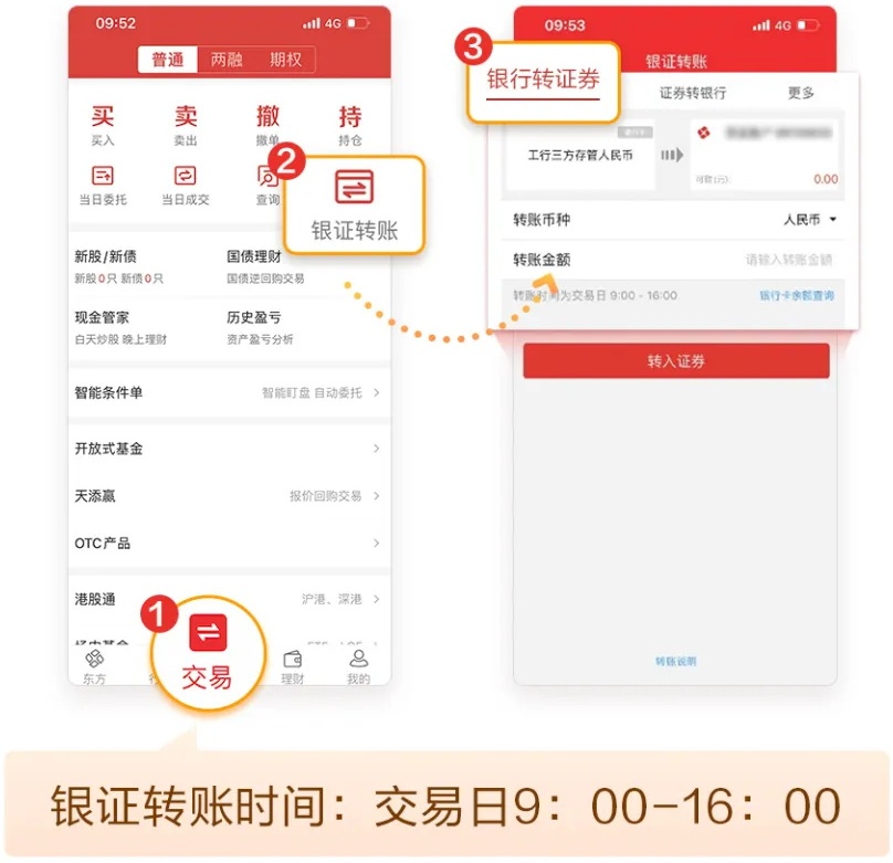 ●前往【交易】频道 - 点击【银证转账】按钮一选择【银行转证券】
