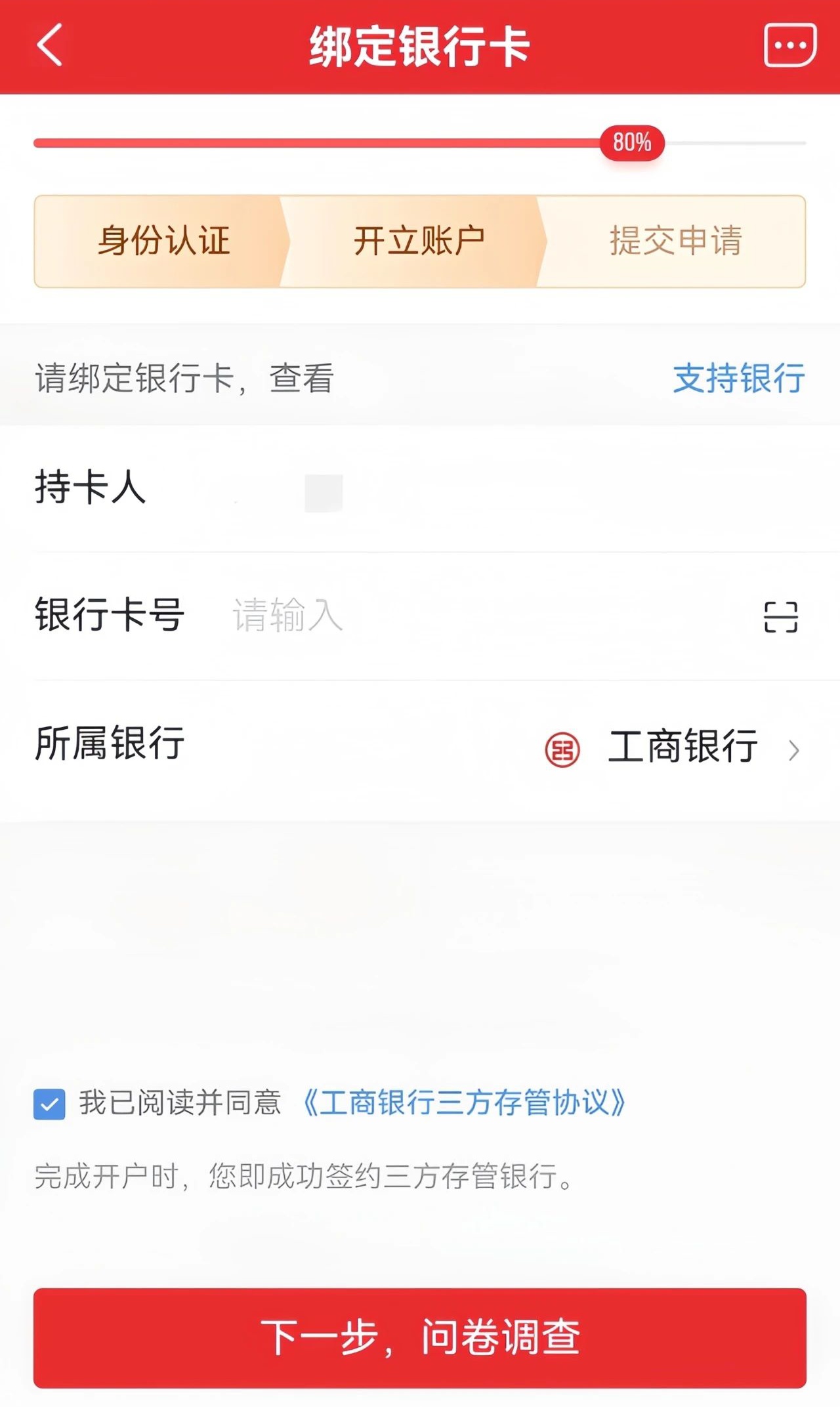 9.进入三方存管签约页面,录入银行卡号,请尽量使用知名的银行,不建议农商行