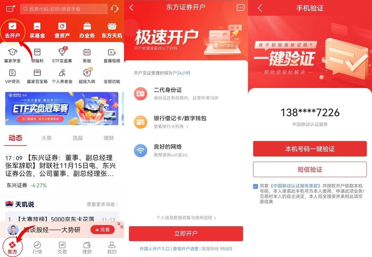 1.下载东方赢家APP,在APP首页选择【东方】→【去开户】→【立即开户】,选择【本机号码一键验证】,其他号码选择【短信验证】,进入下一步