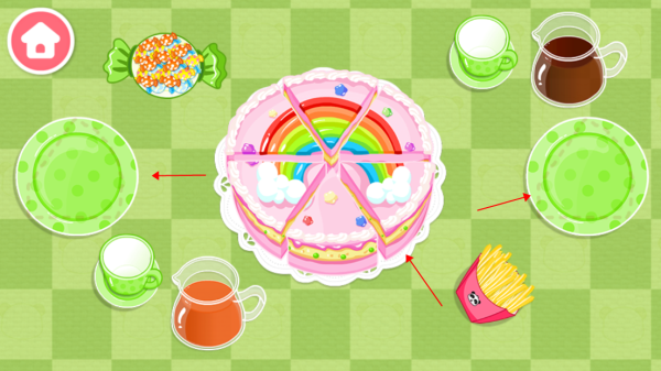 4、每一个环节都设置了互动,比如蛋糕分好之后,宝宝需要动动手把蛋糕放在餐盘上;美味的蛋糕需要用饮料来搭配,餐桌两侧放了两壶不同的饮料,是可乐和橙汁吗?快斟一杯尝尝。
