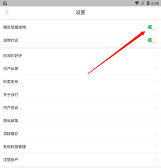 3、进入设置页面,点开横屏隐藏宠物按钮。