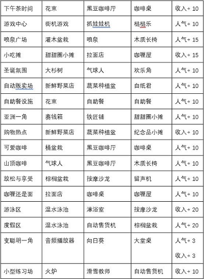 特色区域是游戏中非常重要的特色之一,好的设施搭配不仅可以提高游戏中的美观程度,还可以提高各个店铺的收益和人气。