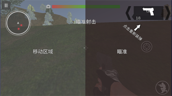 3、左侧空白处可以进行人物的移动,右侧进行瞄准和装弹;