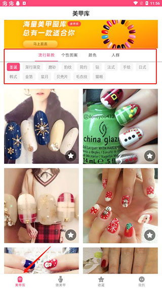 1、打开软件之后在美甲库中可以看到有海量的美甲素材,各种流行新款、个性图案、颜色、豹纹、渐变各种款式全部都有详细的分类;