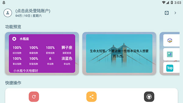 会话微件已经更名为万象小组件,这是一款桌面美化软件,可以有效的帮助用户把桌面变得更加丰富,再也不是孤单的桌面设计了,用户可以对自己的桌面添加对话框,因为自定义对话内容是它主打的特色,支持在桌面上放置人生格言或者诗词名句,让你的桌面更有格调,还可以在桌面和好友聊天,两人都选择对方为好友后就可以互相发送信息,在桌面点击气泡就可以快速发送信息了。软件有着文字功能,能自定义文本内容。还有计时功能,为用户提供倒计时和正计时的功能,支持自定义显J规则,每天更新一次数据。还有着天气功能,能够显示实时天气情况,后台自动刷新数据。功能十分强大。还不赶紧下载起来吧。
