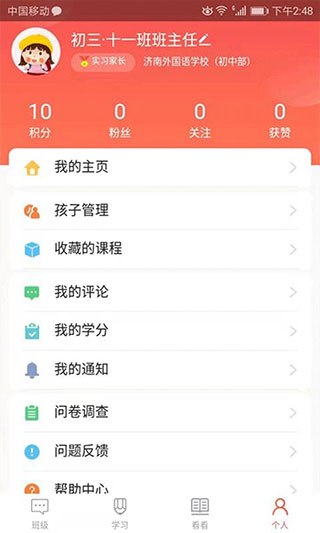 4、点击进入个人界面,就能查看收藏的课程、孩子管理等基本信息了