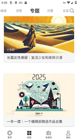 一个App是一款极具韩寒风格的阅读软件,以简约清新著称,在满足阅读需求的前提下,加入许多新鲜具有特色元素,在尽量带给用户丰富优质的阅读体验同时,也可以分享自己阅读的喜悦,与作者或者与你志同道合的读者们在同一平台下沟通留言,让阅读不在那么纯粹,同时其独树一帜的阅读模式,也在为用户打在一个良好的阅读环境,你可以在这款软件上安静的阅读,在任何地方任何地点,发现新的领地,快来这里写下你的故事和心情,生成属于你的小故事吧!