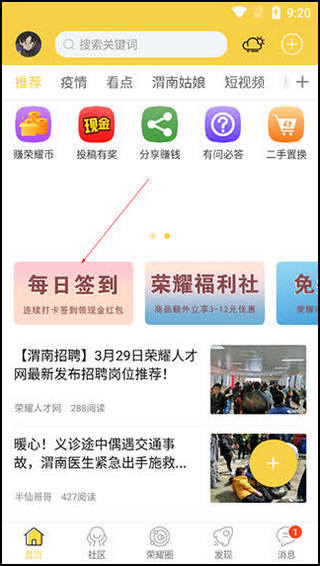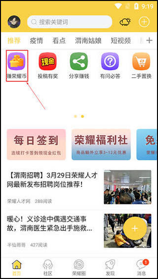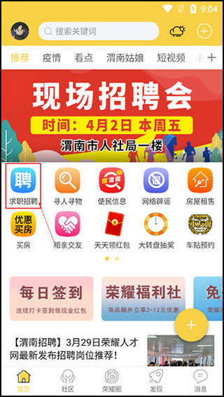 用荣耀渭南网App找工作也挺方便的:点开“求职招聘”,然后进入“急聘专区”就能看到最新的招聘信息。另外,怎么赚荣耀币呢?点击“赚荣耀币”就能完成任务或者签到获取奖励,连续签到还能拿红包,感觉还挺有动力的。