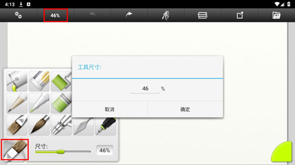 进入软件首页后,可以选择左下角的画笔图案来调整尺寸,也可以选择上方菜单栏中的百分数来调整画笔尺寸