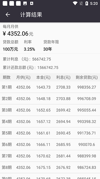 2、输入相应的数据,点击计算即可得到每月的还款金额和累计总还款利息和金额。