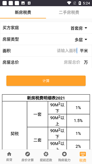 4、税费计算器,支持新房税费计算和二手房税费计算,买房和卖方都可使用。