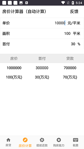 3、房价计算器,支持输入房子面积、房子单价和首付,自动计算总额。