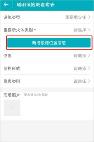 11、点击右下角【+】(新增),打开新增界面,根据实际情况选择【设施类型】(包含“重要承灾体”和“沿线设施”)以及具体的设施内容。