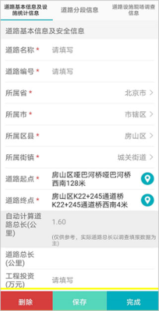 8、若底图道路有,实际没有,在信息填写界面中选择【删除】不再进行调查。