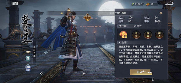 4、楚庄王,橙色级别武将,武力106,统率85,智力64,带兵1000,技能在短时间极速提升战斗力,特性前排性质。