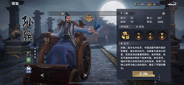 3、孙膑,橙色级别武将,武力52,统率79,智力107,带兵1000,技能召唤烈焰群体攻击敌方,特性能力是远程弓箭手性质。