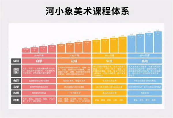 河小象从课程体系上看,针对3-12岁孩子,课时比较多,主要分四个不同阶段,学龄前在启蒙。难度上升都是比较平缓的,一开始教简单的线条、色彩,以认识、了解为主,主打孩子无意识的画,到后几个阶段开始教孩子“创造”,真正学画画。