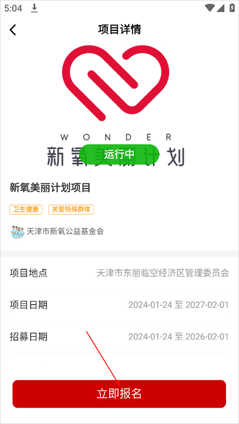 在【首页】中点击【志愿项目】板块,通过筛选条件找到适合自己的志愿活动;进入心仪项目的详情页面后,点击【立即报名】,选择相应岗位并完成报名。需要注意的是,平台只显示对外招募的项目,部分活动可能设有条件限制,需符合条件才能成功参与。