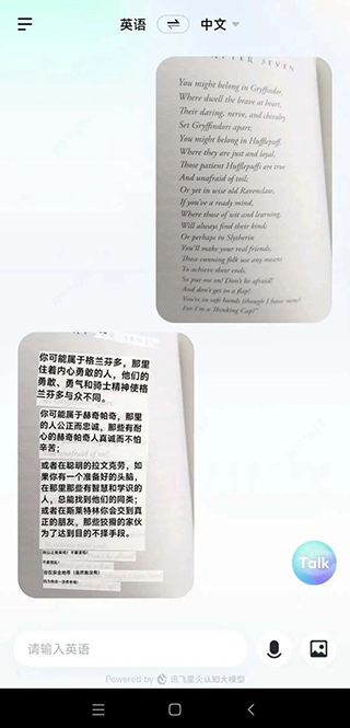 3、为加大一点难度,小编尝试了图片翻译。我找了一本英文版的《哈利波特》,拍了“分院帽”这一章的一段经典歌词(非完整版),来看一下翻译: