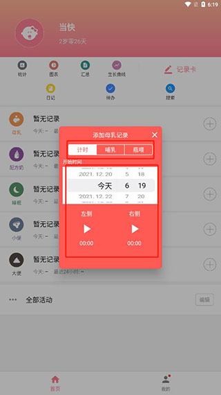 • 喂奶:包括母乳、配方奶、喂泵奶和泵奶记录,同时能以计时方式或补录方式填写记录,并提供闹钟提醒;