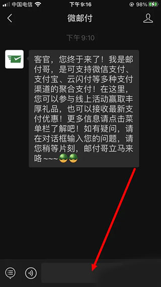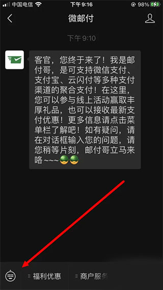 首先在微信里打开【微邮付】公众号,点击【图标】。