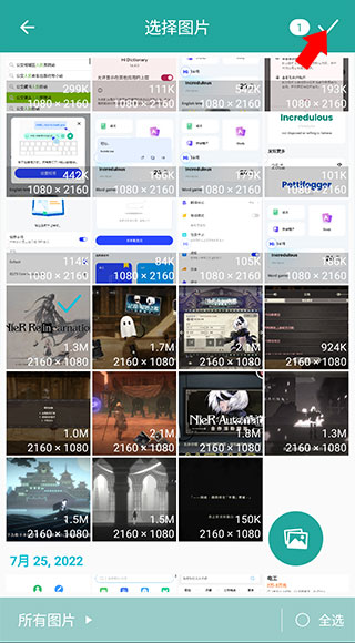 2、选择我们需要进行处理的照片(点击右下角全选按钮可选择全部照片,建议先以单张照片作为参考看看压缩效果)