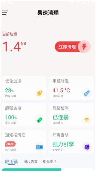 易速清理是一款功能强大且实用的手机清理软件。软件内有多种功能,一键清理垃圾、检测网络状态、优化网络速度、还可以进行安全防护。核心功能有垃圾清理、优化加速、超强省电,专注于解决手机垃圾文件多、响应速度慢、电量消耗快等问题,提升用户使用体验。此外,还拥有网络检测、通知栏清理、微信专清、短视频清理、相似图片清理、图片恢复、应用管理等特色功能,在对手机文件精准扫描后,帮助用户进行专项清理,为手机释放更多存储空间,同时也提供应用锁、图片恢复、病毒查杀等贴心功能,保护用户隐私、解决图片错删误删问题。易速清理还能对CPU降温,延长手机电池使用寿命,易速清理让手机运行更流畅,有需要的朋友欢迎在本站下载使用!